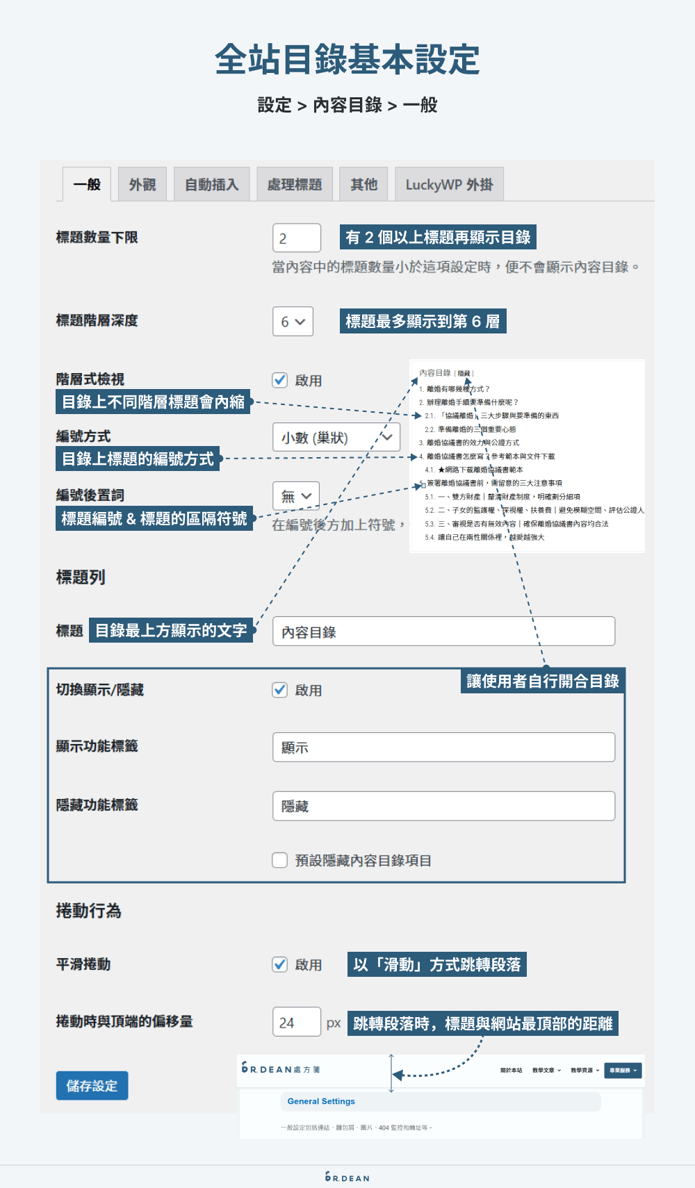 LuckyWP Table of Contents 能設定的目錄進階功能並不多,但有幾個設定還是重要的: